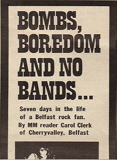 The Belfast born journalist, Carol Clark, summed it up really well in an article she once wrote for the Melody Maker away back in 73 “Bombs, Boredom and no Bands”. Extracts from a teenage diary spelling out her weekly routine. It was Showbands, Cinemas or Disco’s that was the choice you had. You either danced to the record, or to some impostor pretending to be the person you really wanted to see.